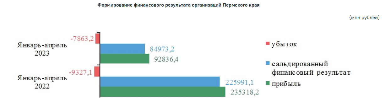 Прибыль организаций Пермского края с численностью более 15 чел., за исключением представителей малого предпринимательства, банков, страховых и бюджетных учреждений, за первые четыре месяца 2023 года снизилась на 62,4% по сравнению с аналогичным периодом прошлого года (АППГ), сальдированный финансовый результат получен в сумме 85 млрд руб. Результаты исследования привёл Пермьстат.