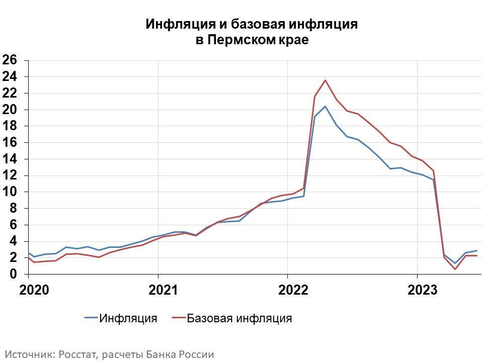 Годовая инфляция в Пермском крае в июне 2023 года увеличилась до 2,8% после 2,6% в мае.