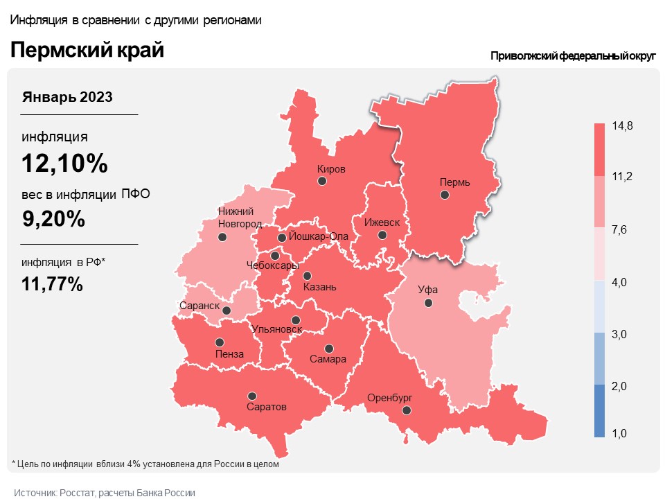 В январе 2023 года годовая инфляция в Пермском крае понизилась на 0,33 п.п по сравнению с декабрём до 12,10%. Несмотря на снижение это выше показателя по Приволжскому федеральному округу (11,71%) и по России в целом (11,77%). Об этом сообщили в Пермском отделении Банка России.