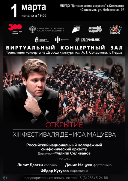 - Приглашаем жителей Соляной столицы в наш концертный зал 1 и 2 марта в 19.00, - говорит директор Детской школы искусств Ольга Штейн . - Программа фестиваля таит в себе сюрпризы и приятные встречи, которые подготовил Денис Мацуев для нашей публики.