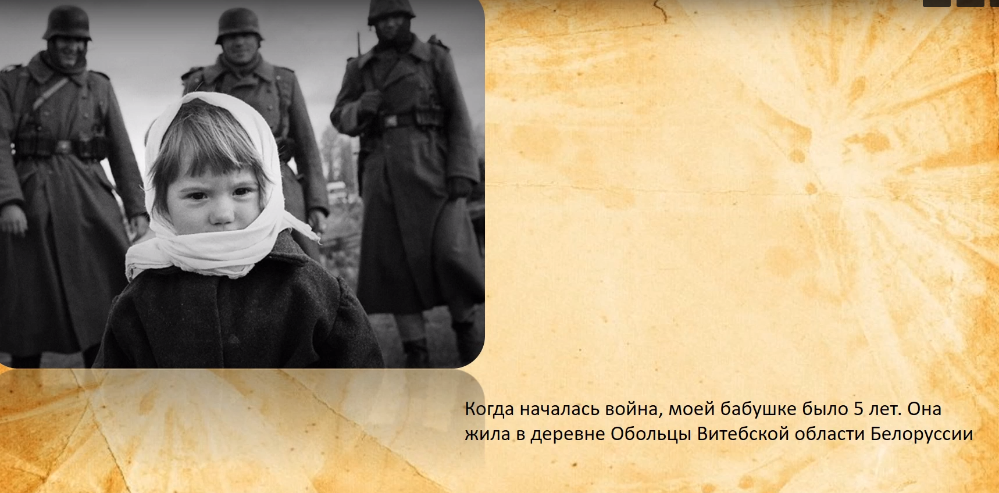 «Когда началась война, моей бабушке было 5 лет. Она жила в деревне Обольцы Витебской области Белоруссии.