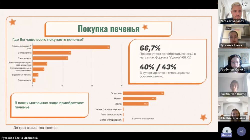 На защите итоговых проектов студенты представили анализ рынка FMCG в разрезе конкретных продуктовых категорий — кофе и печенья, а также дерево принятия потребителями решения о покупке товаров, выстроенное на основе нескольких этапов качественного и количественного маркетингового исследования.