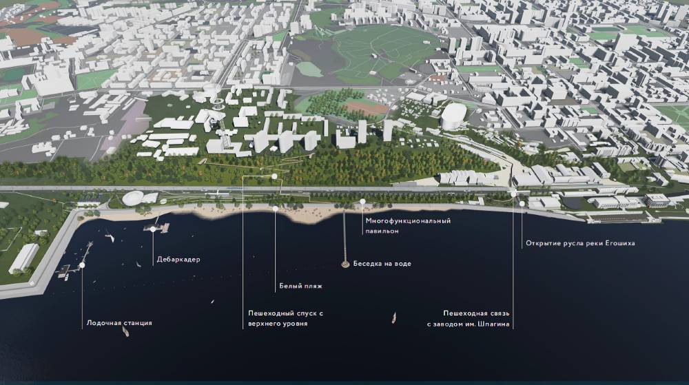 На ней указано, что между набережной и пространством «Завод Шпагина» будет организована пешеходная связь. Рядом обозначено место, где планируется открыть русло реки Егошихи, которое сейчас спрятано в подземную трубу.