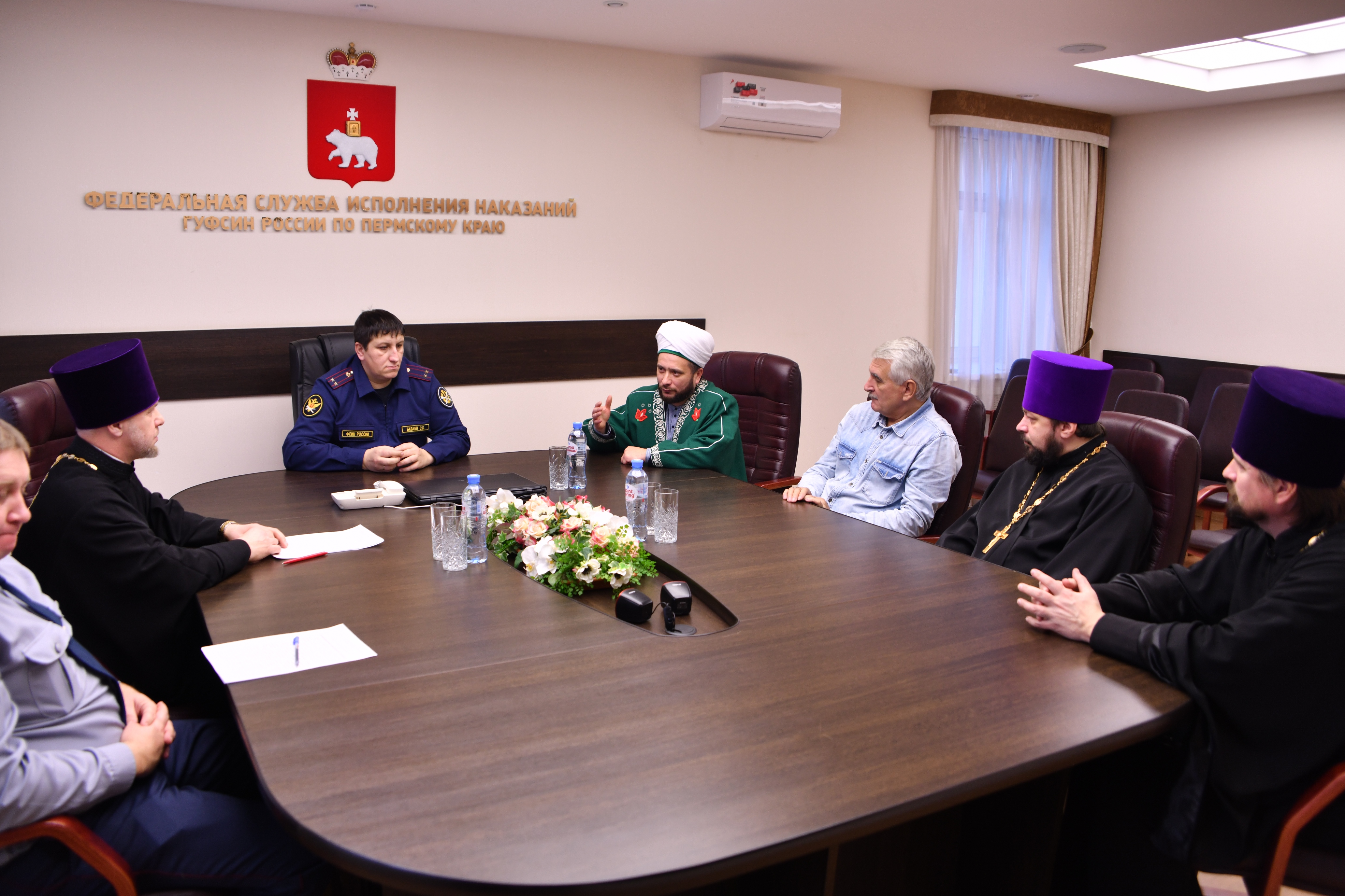 По итогам проведенного комплекса мероприятий сегодня в Главном управлении состоялся круглый стол, в котором приняли участие врио начальника ГУФСИН России по Пермскому Самир Бабаев, Председатель Регионального духовного управления мусульман Пермского края Анвар хазрат Аблаев, помощник начальника ГУФСИН России по Пермскому краю по организации работы с верующими священник Владимир Киров, председатель Совета ветеранов УИС Виталий Злобин, начальник отдела воспитательной и социальной работы с осужденными Павел Колычев, настоятель храма Иверской иконы Божией Матери г. Перми священник Сергий Дунин, настоятель храма Преображения Господня села Гамово священник Михаил Ожиганов.
