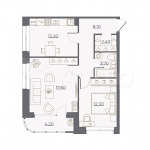- Площадь кухни: 12.2 м²