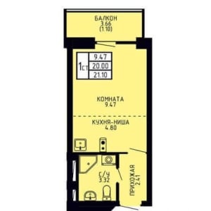 - Общая площадь: 21.1 м²