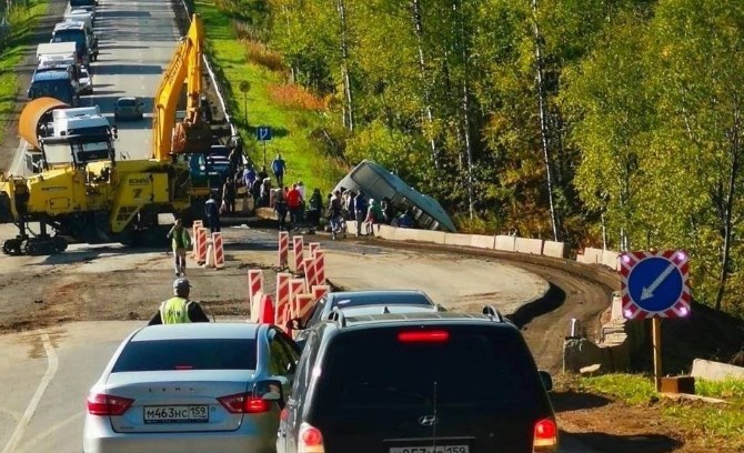 Сегодня утром на трассе Пермь-Березники рейсовый автобус на 170 км автодороги врезался в стоящую на дороге спецмашину, которая ремонтировала дорогу, и улетел в кювет.